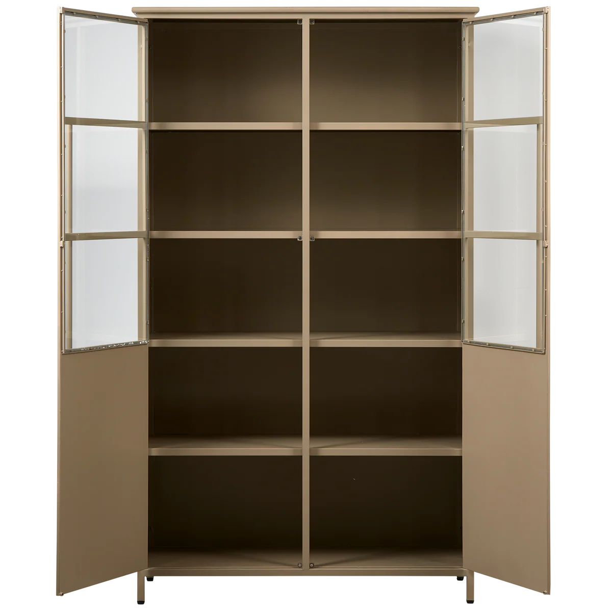 BePureHome vitrinekast EXHIBIT in de stijlvolle kleur khaki geeft je interieur een warme, moderne uitstraling. De combinatie van slank metaal en helder glas zorgt voor een luchtige, elegante look, terwijl je je favoriete servies, decoratie of verzamelstukken prachtig kunt presenteren. Je creëert een persoonlijke, sfeervolle display die volledig aansluit bij jouw woonstijl.