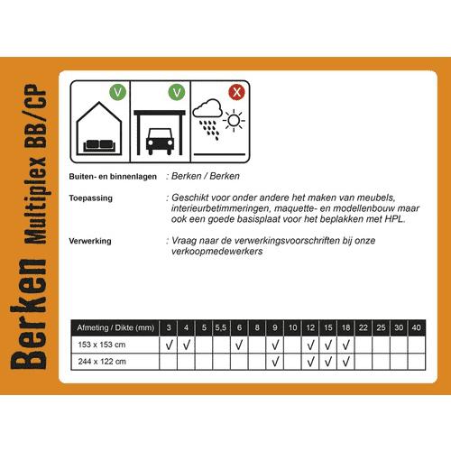 Hoogwaardig Russisch berken triplex. Toepassing: droge omstandigheden. Opbouw: berken. Kwaliteit: BB/CP. Gebruiksklasse: EN 636-1 droge omstandigheden. Volumieke massa: ± 700 kg/m³.