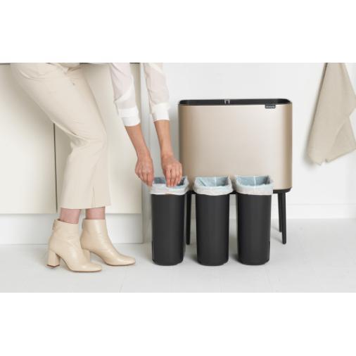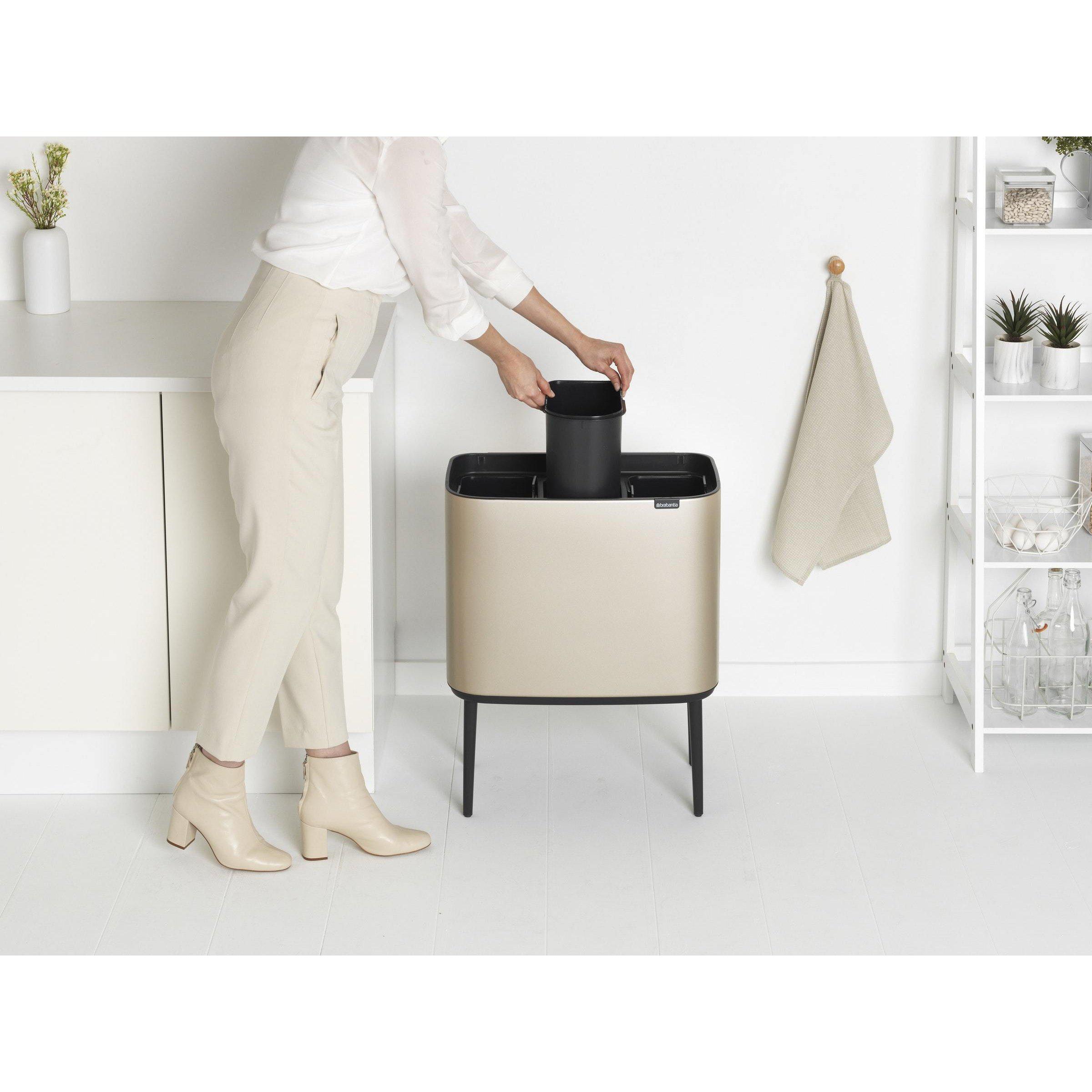 Op zoek naar een mooie oplossing om afval te scheiden? Deze Bo Touch Bin combineert een prachtig design met een groot talent voor afval scheiden. Dankzij drie losse binnenemmers kan Bo 3 soorten afval aan. Bo past perfect tegen de muur (ruimtebesparend!), en is erg stabiel dankzij de verstelbare anti-slip pootjes. Makkelijk en licht te bedienen - sluit met de zachtste aanraking.Voordelen & KenmerkenSoft Touch' open- en sluitsysteem - opent stil bij de lichtste aanraking.Ruimtebesparend - past strak tegen een wand of in een hoekje.Makkelijk weggooien zonder knoeien - grote opening.Ideale hoogte - beter voor je rug en makkelijk eronder schoonmaken.Perfect voor grotere klussen - deksel blijft open.Makkelijk in elkaar te zetten - pootjes eenvoudig vast te klikken.Verstelbare pootjes met anti-slip - beschermt de vloer en houdt de afvalemmer op zijn plaats.Simpel schoonmaken - uitneembare kunststof binnenemmer.Cradle to Cradle gecertificeerd - Brons niveau3 uitneembare binnenemmers - ideaal voor afval scheiden thuis.Inclusief proefverpakking Brabantia PerfectFit Bags (code X) - makkelijk aanbrengen, zonder lelijke overhang.Prachtig design met een beetje bling