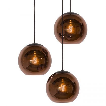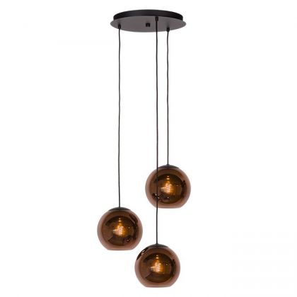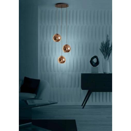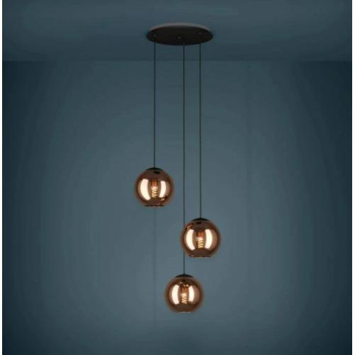 EGLO hanglamp Cordoba is uitgevoerd met drie bolvormige lampenkappen van koperkleurig glas. De lampenkappen hangen op verschillende hoogtes aan zwarte textielkabels die zijn bevestigd aan een langwerpige metalen plafondplaat in dezelfde kleur. Het spiegelende glas zorgt voor een elegante en verrassende uitstraling, waarbij de lichtbronnen pas zichtbaar worden als de lamp aan is. Deze hanglamp is een stijlvolle aanvulling op moderne interieurs en komt prachtig tot zijn recht boven de eettafel of salontafel. Er zitten geen lichtbronnen bij deze hanglamp. Maak de lamp compleet door zelf passende E27-lichtbronnen aan je winkelmand toe te voegen.