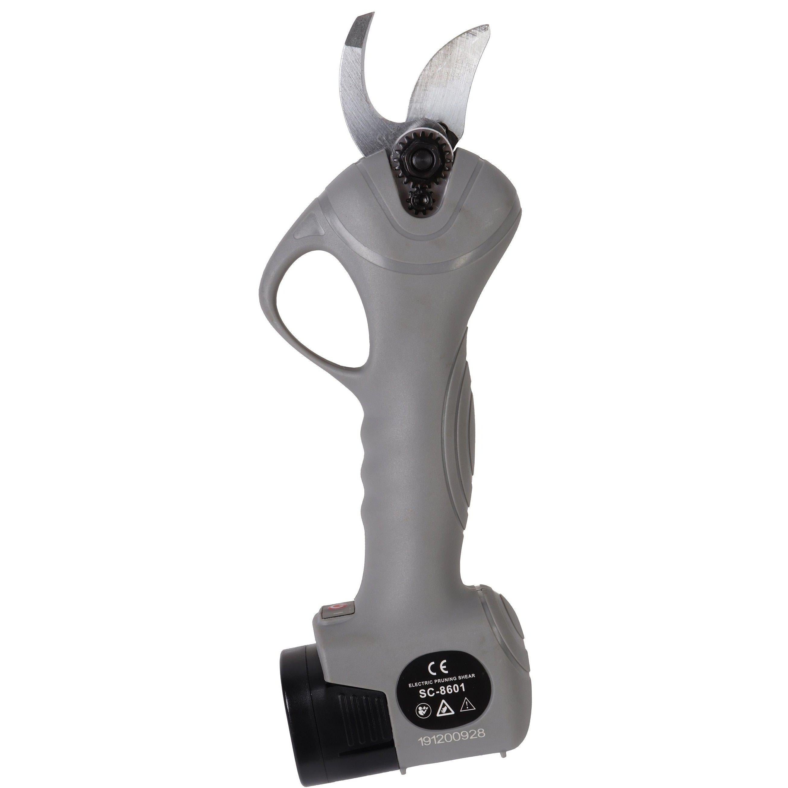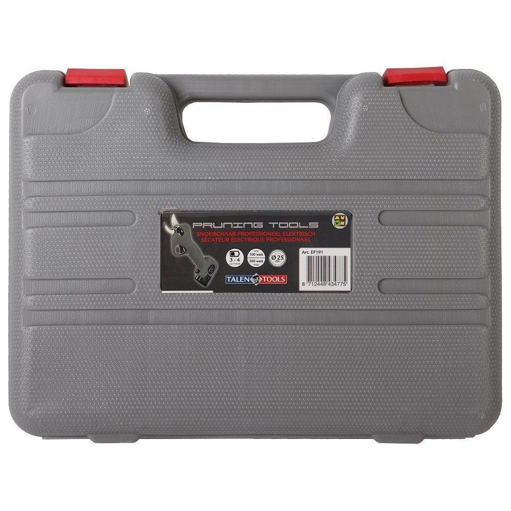 "Met deze elektrische snoeischaar bespaar je veel kracht en tijd! De snoeischaar snoeit takken tot 25mm dik en heeft een accuduur van 3 - 4 uur. Bij de snoeischaar zit een opbergkoffer, 2 accu’s en een oplader.