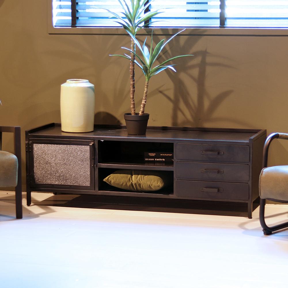 Tv-meubel Industrieel 22522 van het merk Eleonora is een stoere kast met een industrieel uiterlijk. Dit dressoir bestaat uit 1 deur en 3 lades. De kast bestaat volledig uit zwart gecoat staal.