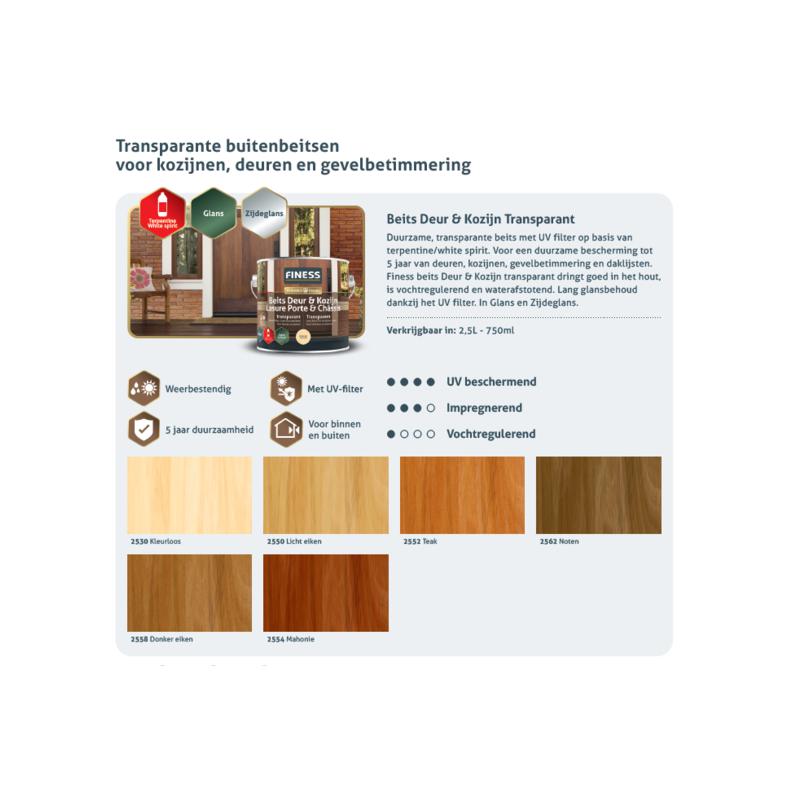 Duurzame, vochtregulerende en transparante zijdeglanzende beits met UV filter. Biedt 4 jaar bescherming aan alle houtwerk als ramen, deuren en gevelbetimmeringen. Dringt goed in het hout en hecht uitstekend. Ook geschikt voor geïmpregneerd hout. Goed bestand tegen weersinvloeden. Voor buiten.