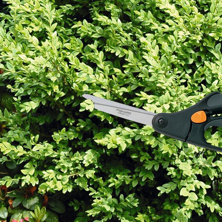 "De Fiskars graskantenschaar S50 is een ergonomisch ontworpen stuk gereedschap met unieke, gebruiksvriendelijke kenmerken, geschikt voor precisiewerk in de tuin. Door de ingenieuze Servo-Systeem™ technologie kunnen de bladen niet vastlopen. Deze schaar is ideaal voor het strak knippen van buxus, taxus en andere struiken. Comfort wordt gegarandeerd door de SoftGrip™ afdeklaag op de bovenste handgreep en de spanning van de bladen is verstelbaar via de scharnierschroef, zodat de precisie altijd constant is. Het veermechanisme bespaart kracht en maakt snoeien makkelijker, omdat de handgrepen na elke knip soepel opengaan.