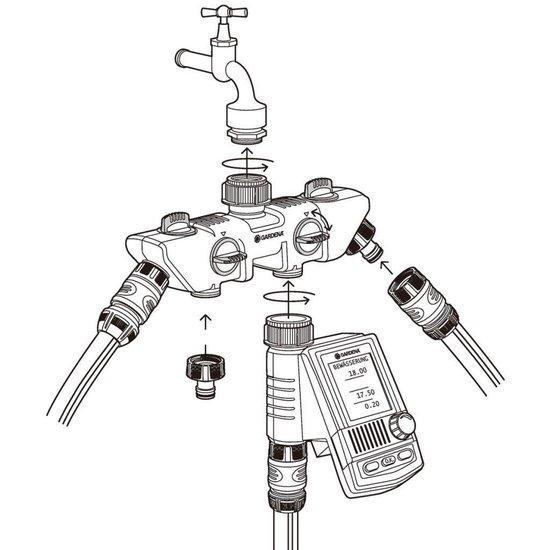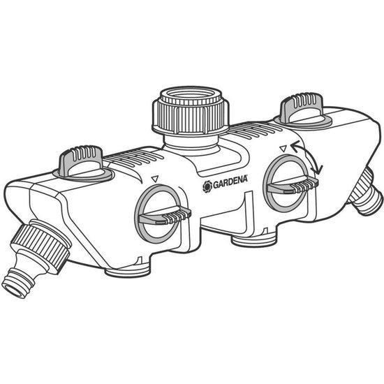 Met de GARDENA 4-weg waterverdeler kunt u gelijktijdig diverse accessoires aansluiten op een kraan. De waterafgifte kan voor elke aansluiting afzonderlijk worden geregeld of afgesloten. Op de 4-weg waterverdeler kunnen twee GARDENA besproeiingscomputers of watertimers worden aangesloten. De 4-weg waterverdeler kan met het Prof-System kraanstuk (art.nr. 2801-20) worden omgezet in het GARDENA Prof-System voor een grotere waterdoorvoer.De GARDENA 4-weg-waterverdeler is geschikt voor 26,5 mm (G3/4)-waterkraan met en 33,3 mm (G 1)-draad en 21 mm (G 1/2)-waterkraan met 26,5 mm (G 3/4)-draad.