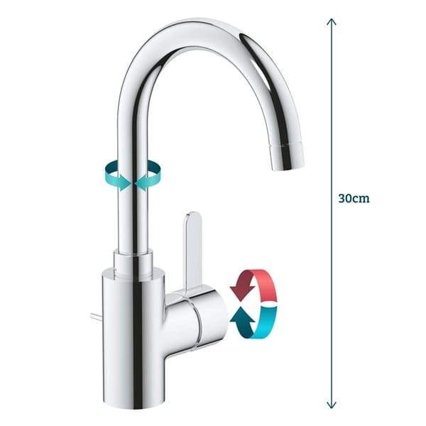 DEZE STIJLVOLLE GROHE EUROSMART WASTAFELMENGKRAAN FEATURES EEN HOGE DRAAIBARE UITLOOP EN EEN POP-UP WASTE SET VOOR EXTRA COMFORTDeze veelzijdige kraan met een hoge draaibare uitloop voor extra gebruiksgemak zit boordevol GROHE technologie waardoor deze een genot is om te gebruiken. Zelfs het wassen van je haar boven de wastafel vormt geen enkel probleem. De kraan bevat GROHE SilkMove technologie waardoor de regeling van je waterstroom en temperatuur soepel en nauwkeurig is, terwijl GROHE EcoJoy helpt om water te besparen. De waterstroom wordt beperkt tot 5.7 l/min maar biedt nog altijd een geweldige douche-ervaring. Deze glanzende wastafelkraan heeft een pop-up waste en is afgewerkt in GROHE StarLight chroom, waardoor deze makkelijk te reinigen en ontzettend duurzaam is. Deze makkelijk te installeren mengkraan is ook voorzien van onze GROHE QuickFix easy installation systeem. Dot betekent dat je deze in helft van de gebruikelijke tijd zal kunnen installeren!