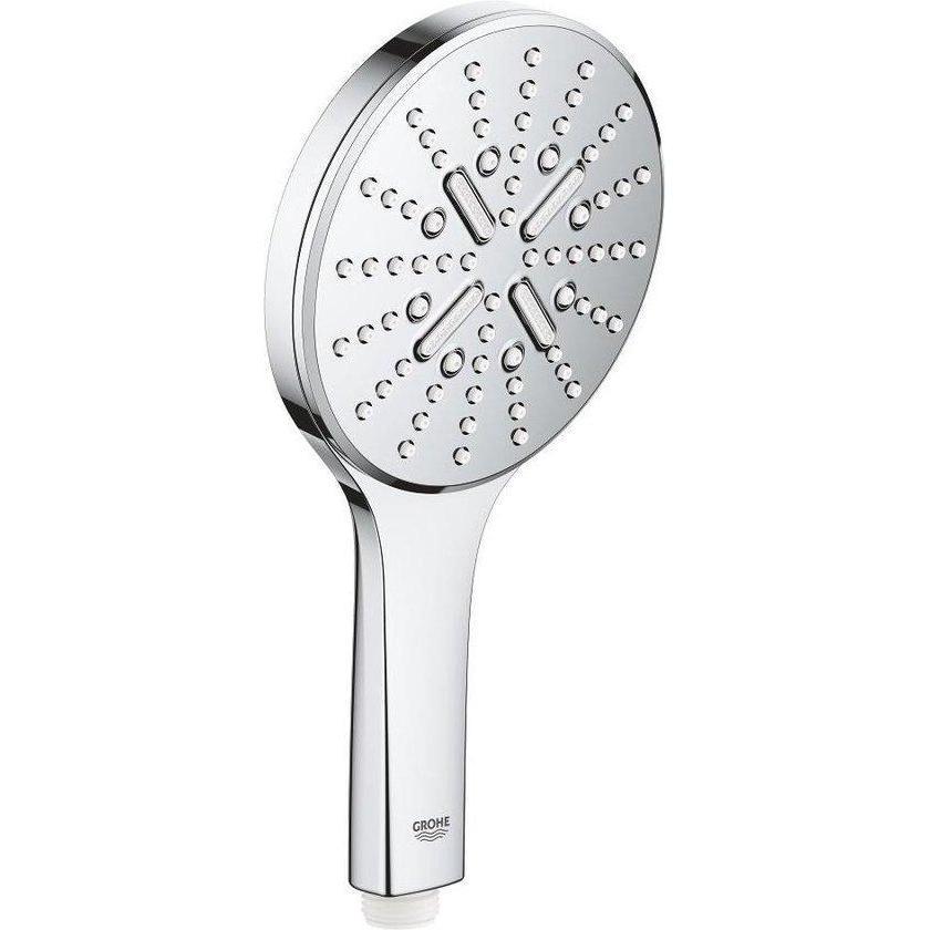 De geavanceerde GROHE Rainshower 130 SmartActive handdouche is snel en eenvoudig te installeren en levert eersteklas badkamerprestaties. Deze handdouche is gemaakt in Duitsland en zit boordevol innovatieve technologie. Met de drie geweldige straalsoorten is het een genot om deze douche te gebruiken.GROHE SmartTip - een ergonomische controller aan de achterkant van de handgreep - geeft je vingertopcontrole over het sproeipatroon. Kies je voor de pulserende GROHE ActiveMassage-straal, die een geheel nieuw niveau van revitaliserende massagekracht levert, de verkwikkende Jet Spray of toch de Rain Spray? Zodra je het water uitschakelt, zorgt GROHE DripStop ervoor dat er geen vervelende druppels na blijven lopen. En dankzij GROHE DreamSpray heeft elk mondstuk een perfect uitgebalanceerde stroom voor maximale tevredenheid. Bovendien voorkomt de Inner WaterGuide dat het oppervlak te warm wordt, waardoor zowel je huid als de douchekop worden beschermd.De SpeedClean-antikalksproeiers zijn extra gemakkelijk schoon te maken en dankzij de duurzame GROHE StarLight chromen afwerking is de handdouche krasbestendig en blijft hij er jarenlang ongerept uit zien.GROHE Rainshower 130 SmartActive handdouche - een mix van modern design en eersteklas prestaties!Voordelen:GROHE EcoJoy® voor een milieuvriendelijke doucheEen volle douchestraal met GROHE DreamSpray®: voor een gelijkmatige waterverdeling over alle sproeigaatjesPulserende douchekracht met GROHE ActiveMassageRain straal geeft fijne druppels met het effect van een regenbui en verkwikken je lichaamJet straal: een gerichte hardere straal ideaal voor een massage of reinigingVolledige controle over de straalsoorten dankzij vingertopbedieningGeen irritante druppels meer met GROHE DripStopHet super gladde oppervlak is krasbestendig, laat zich makkelijk schoon maken en heeft een mooie glansSpeedClean houdt je douche kalkvrij en garandeert een langere levensduurMet Inner WaterGuide wordt de handdouche nooit te warm en wordt bovendien de chroomlaag beschermd