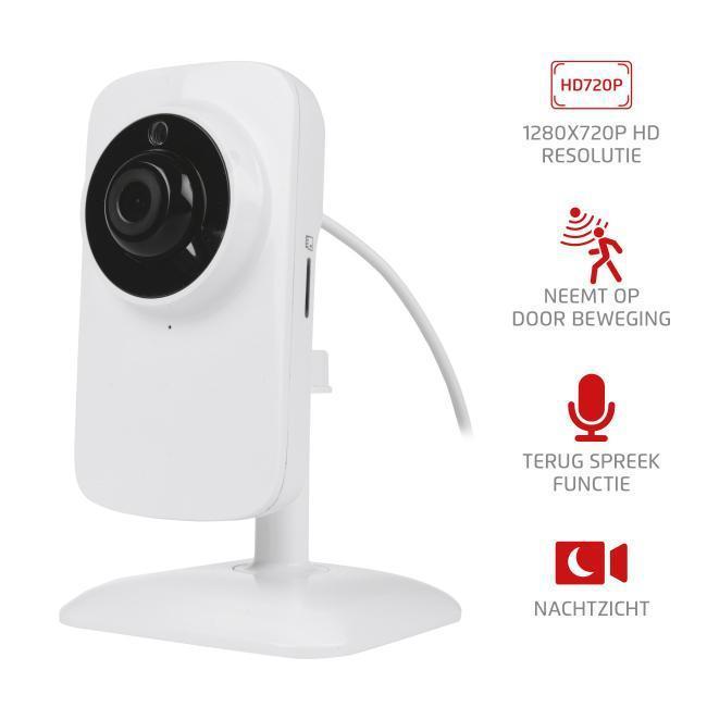 Wifi IP-cameraIPCAM-2000Wi-Fi IP-camera met nachtzicht om jouw huis en dierbaren overal ter wereld te kunnen bewaken.Afbeeldingskwaliteit in hoge definitie en groothoeklens met nachtzichtBekijk live camerabeelden en neem video’s op met jouw smartphone/tabletPlaats de camera waar je maar wilt in jouw huis en verbind die met het Wi-Fi-netwerkSla video’s op uw micro-SD-kaart op (max. 64 GB)Krijg een melding op jouw smartphone/tablet als de camera beweging detecteertIngebouwde luidspreker: praat met mensen via de cameraHouder met montagegaten voor gemakkelijke plaatsing op een oppervlak of montage aan een muur