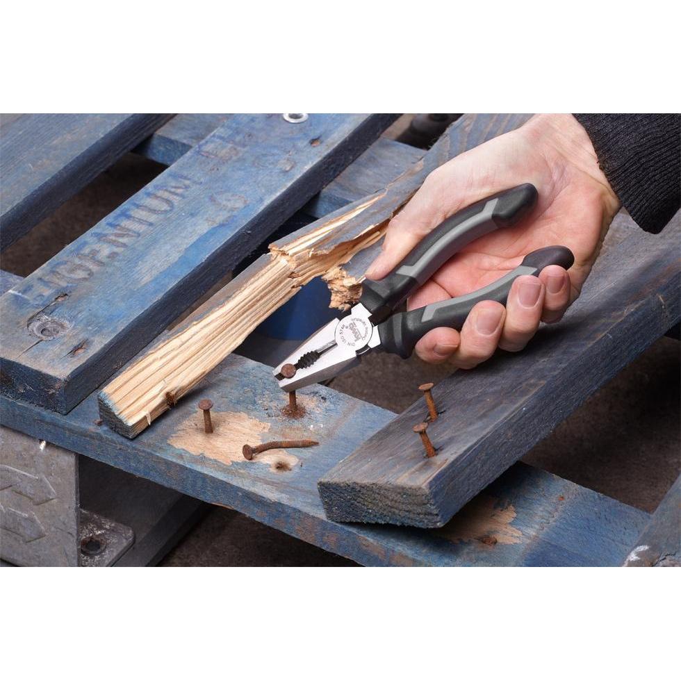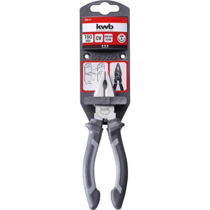 combinatietang, vorm volgens iso 5746, cv-staal, satijnmatte afwerking, 2 componentengreep voor een optimale krachtoverdracht en meer comfort tijdens het werken, met grijpvlakken voor vlak en rond materiaal voor veelzijdig gebruik, met vlakke snijkanten en afgeschuinde kop, voor harde en zachte draad, snijkanten gehard. Met handige tanghouder voor de werkplaats: de kunststof clip wordt gewoon op de gereedschapswand geschroefd.