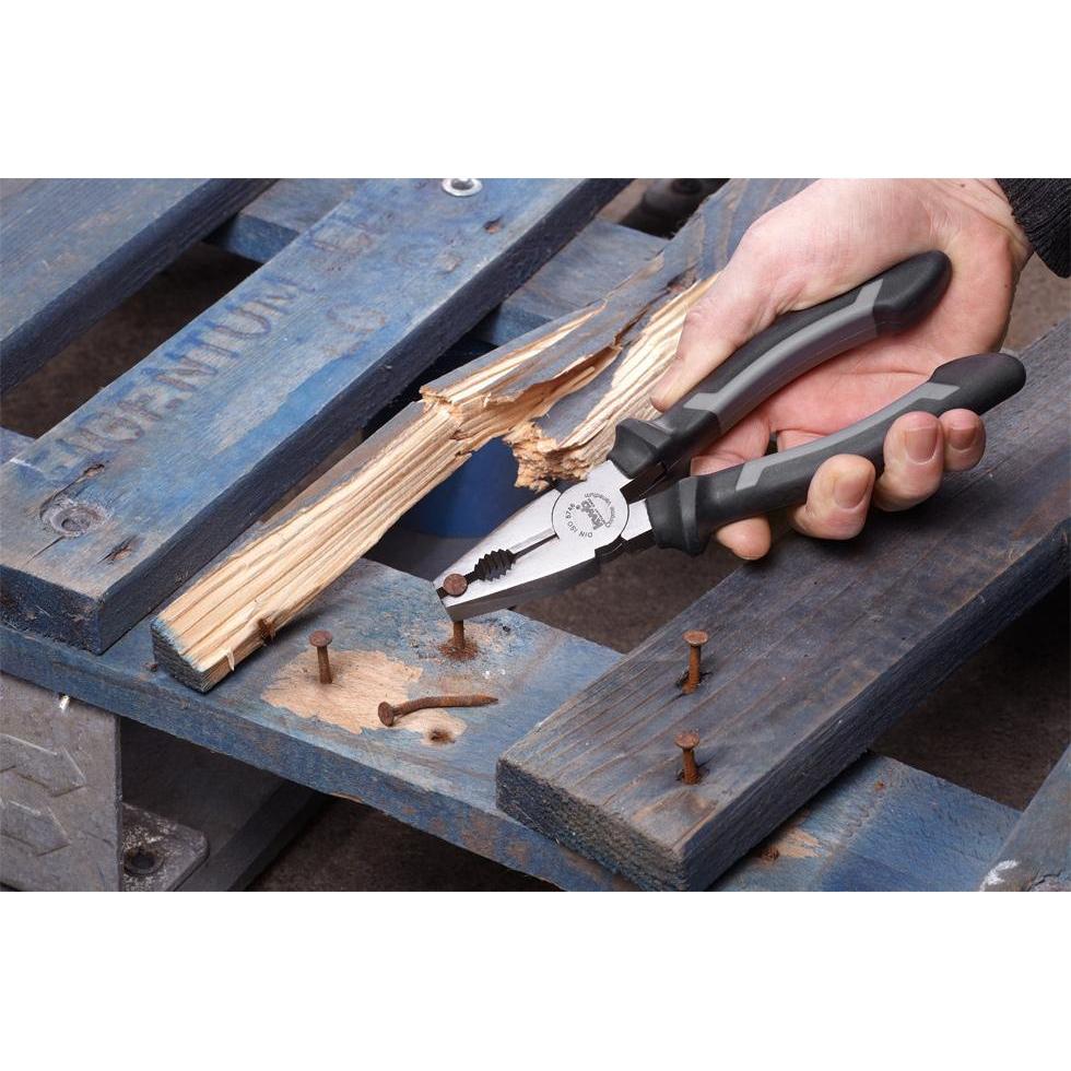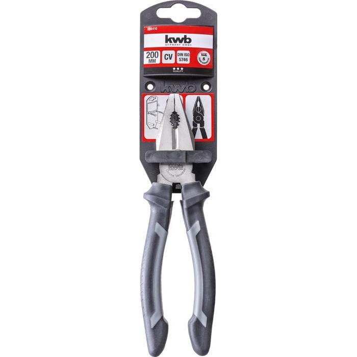 combinatietang, vorm volgens iso 5746, cv-staal, satijnmatte afwerking, 2 componentengreep voor een optimale krachtoverdracht en meer comfort tijdens het werken, met grijpvlakken voor vlak en rond materiaal voor veelzijdig gebruik, met vlakke snijkanten en afgeschuinde kop, voor harde en zachte draad, snijkanten gehard. Met handige tanghouder voor de werkplaats: de kunststof clip wordt gewoon op de gereedschapswand geschroefd.