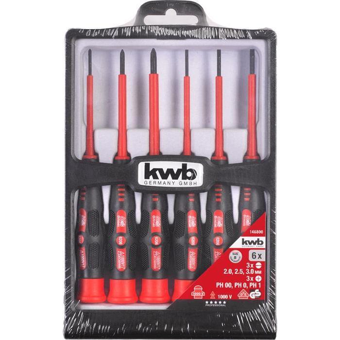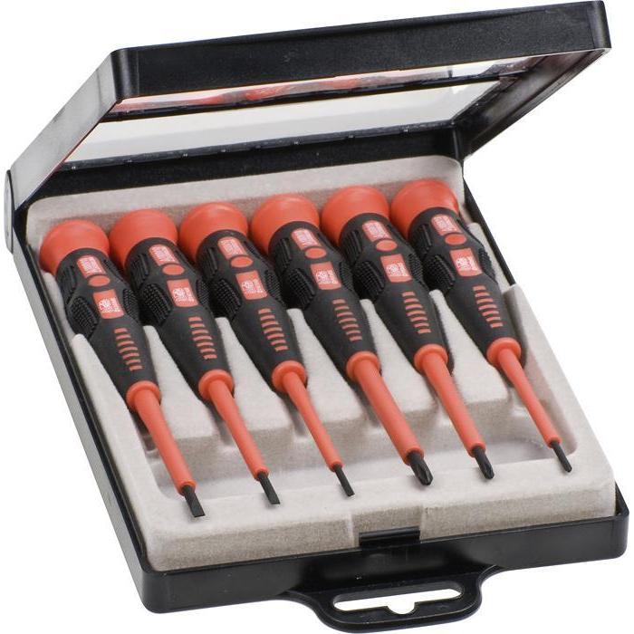 VDE-gekeurd, CV-staal, 2 componentenheft, met draaikop voor een optimale krachtoverdracht en om gemakkelijk te kunnen werken in fijne mechaniek, steel compleet geïsoleerd, met gebruineerde precisiekop, in kunststof cassette.
