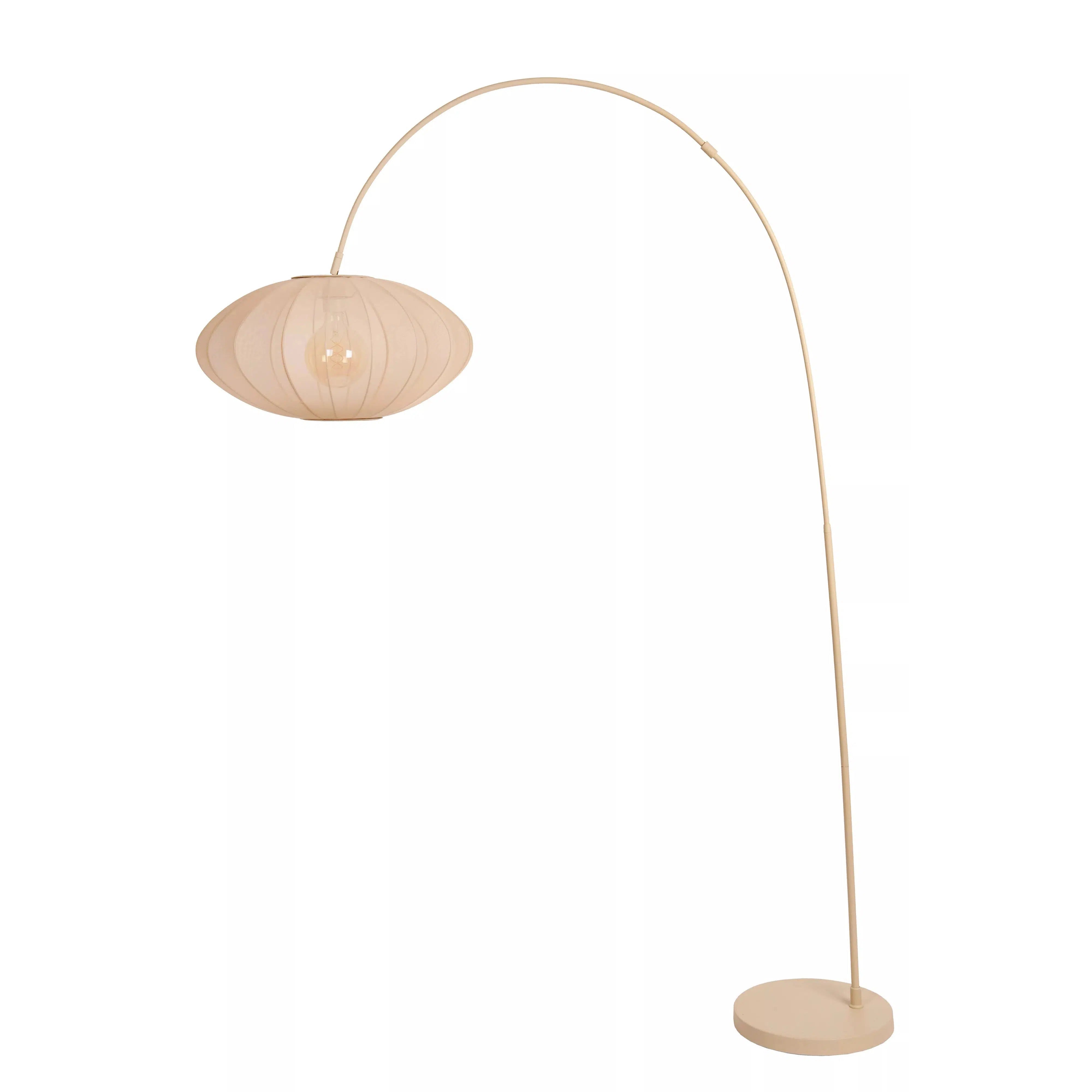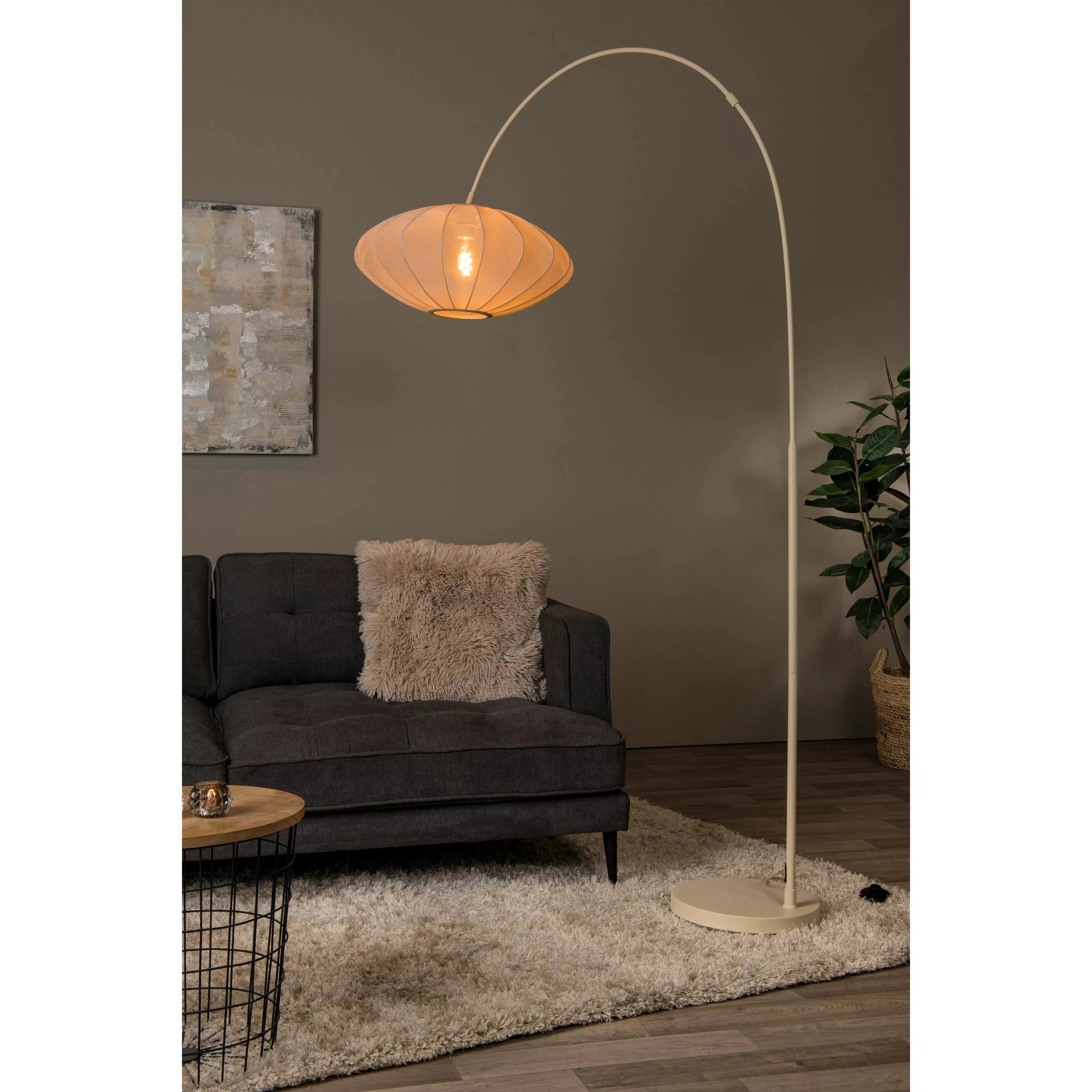 Lucide vloerlamp Corina geeft je woonkamer of leeshoek een elegante en warme uitstraling. De royale stoffen lampenkap van 55 cm verspreidt zacht, diffuus licht dat zorgt voor een sfeervolle en ontspannen ambiance. De sierlijk gebogen voet voegt een modern accent toe, terwijl de lamp dankzij de schakelaar in het snoer eenvoudig te bedienen is. Gemaakt van hoogwaardig polyester met afmetingen van B55 × D131 × H192 cm. Er zit geen lichtbron bij deze lamp. Maak de lamp compleet door een passende E27-lichtbron aan je winkelmand toe te voegen.