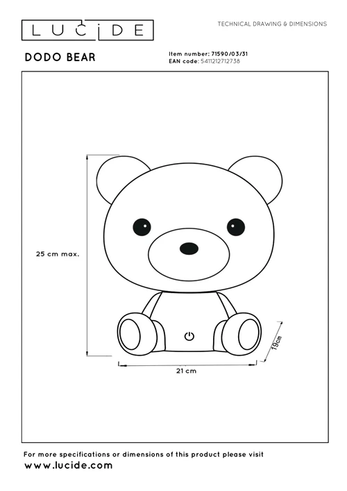 Een nieuw maatje voor de kinderkamer: tafellamp Dodo. Met zijn vriendelijke uitstraling en zacht, diffuus licht creëert Dodo een rustige sfeer die perfect is voor het slapengaan. De lamp is gemaakt van hoogwaardig ABS, een kindveilig en stevig materiaal dat lang meegaat. Dankzij de ingebouwde dimmer pas je eenvoudig de lichtsterkte aan, van een zacht nachtlampje tot wat extra licht tijdens het voorlezen. Dodo is verkrijgbaar in verschillende uitvoeringen, als beertje, konijntje of kikker.