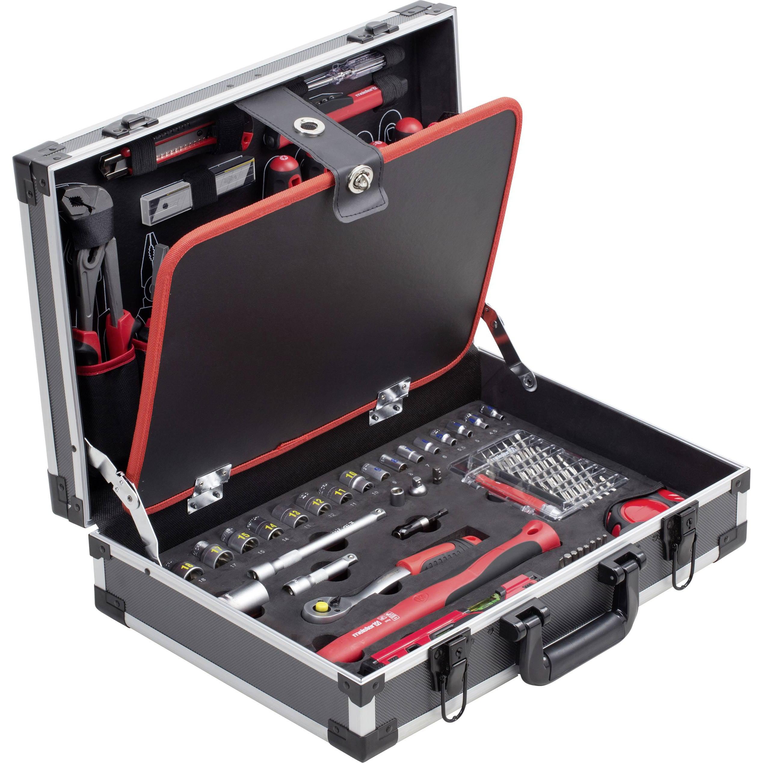 Met de 121-delige gereedschapskoffer van meister krijgt u een groot assortiment gereedschappen. Ontdek de veelheid aan hoogwaardig handgereedschap - van schroevendraaiers tot dopsleutels en ratelsleutels tot de bankhamer, penlight en tang. Of het nu voor de werkplaats, de garage of het huishouden is: de gereedschappen in deze koffer kunnen in alle situaties worden gebruikt en zijn geschikt voor een breed scala aan toepassingen, van precisiemechanica tot assemblage