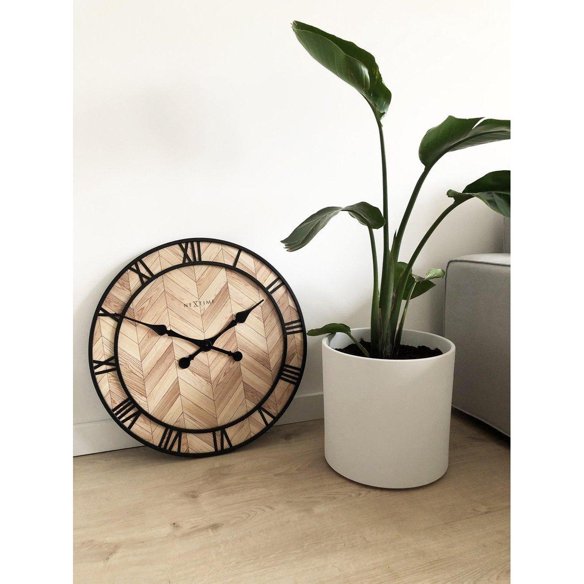 De wandklok NeXtime Roman Vintage is een robuuste klok. De Roman Vintage is voorzien van lichtbruine houten wijzerplaat en heeft zwarte romeinse indexnummers. De klok heeft metalen indexnummers en elegante zwarte wijzers. De combinatie van verschillende kwaliteitsmaterialen en een decoratief visgraatpatroon geeft deze klok een bijzonder vleugje Design. Deze stille klok werkt op 1 AA-batterij (niet inbegrepen).