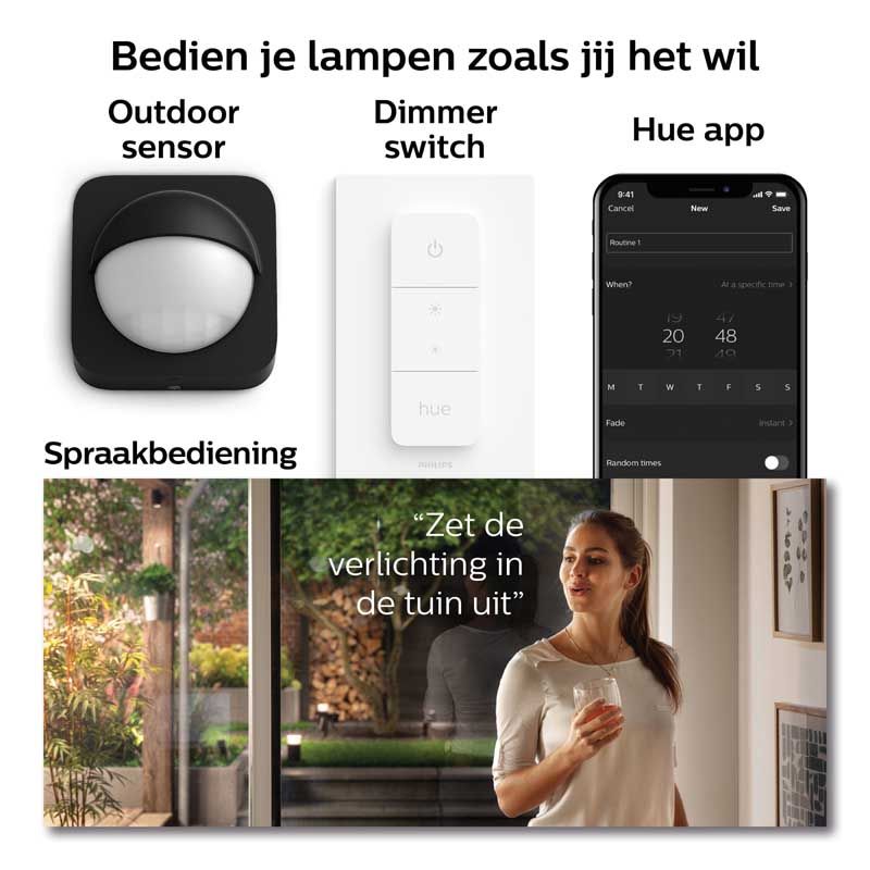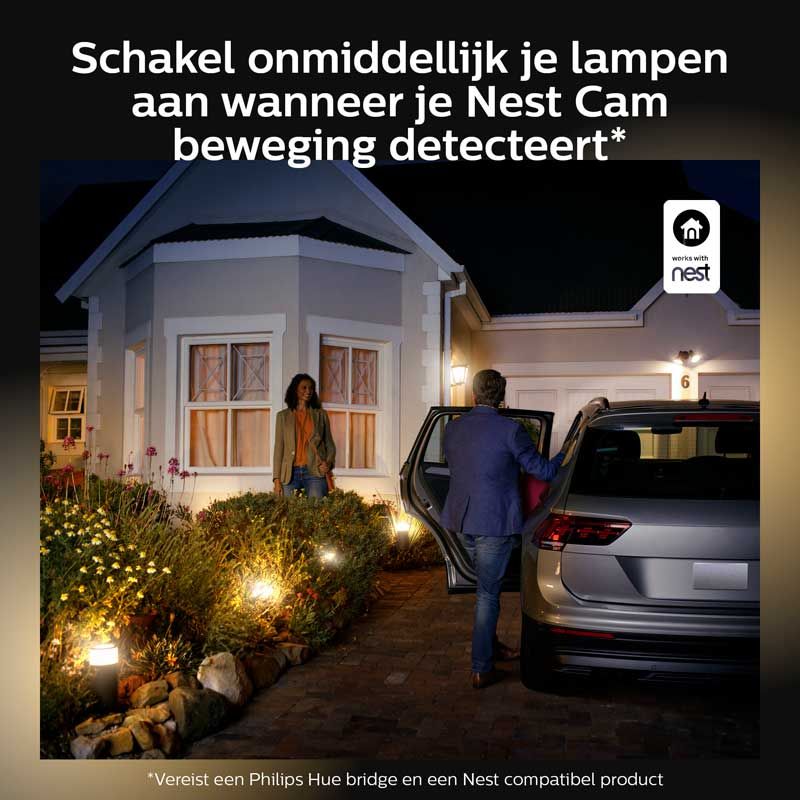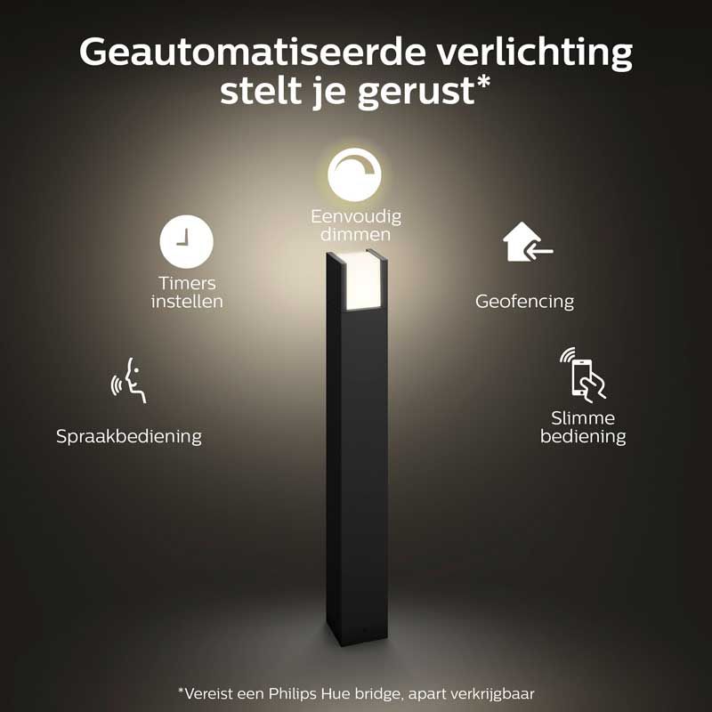 Heb jij al Philips Hue in je huis? Breid je Hue verzameling nu ook uit naar buiten! De lantaarn is makkelijk te verbinden met je Hue Bridge en is eenvoudig te installeren op je telefoon. De hoge lichtopbrengst verzekert jou van een warm welkom als je thuis komt. Met de slimme verlichting van Philips Hue heb jij alles in de hand!