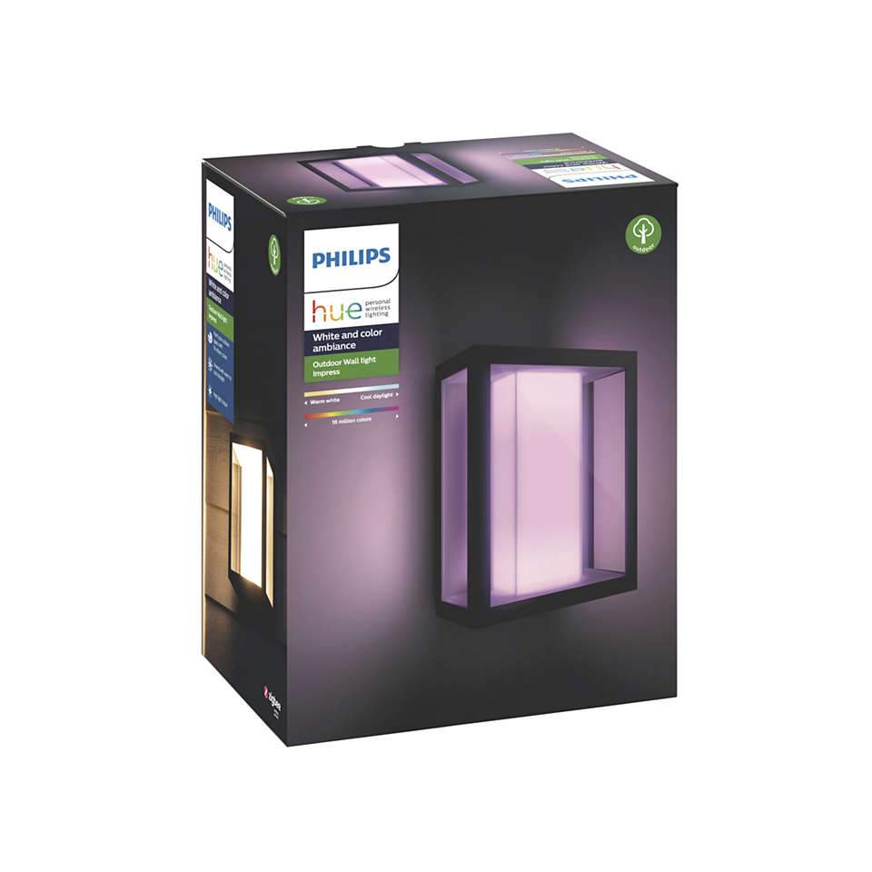Philips Hue buitenwandlamp Impress vierkant zwart combineert modern design met slimme verlichting. De aluminium behuizing in zwart en de heldere glazen lampenkap zorgen voor een stijlvolle uitstraling die past bij elke gevel. Als de lamp aan is, verspreidt het licht sfeervol wit of gekleurd licht via de Hue White and Color Ambiance-functie. Perfect voor terras, balkon of tuinpad. De lichtbron is inbegrepen en energiezuinig LED, dimbaar via Philips Hue.