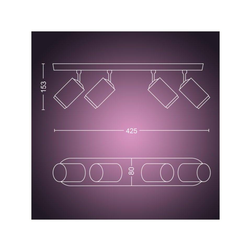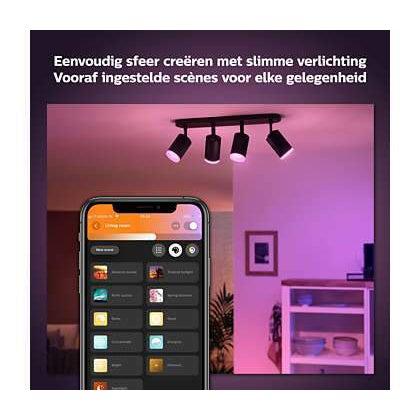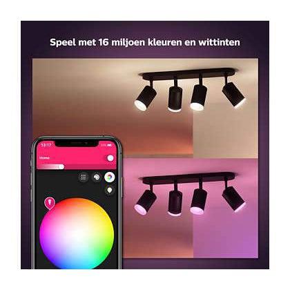 Met de zwarte Philips Hue Fugato opbouwspot creëer je gemakkelijk de gewenste sfeer, want de 4 white and color ambiance LED-lampen kunnen tot wel 50.000 wittinten en 16 miljoen kleuren aan. De spots, op een rechthoekige voet, hebben aan het uiteinde een ring die in kleur oplicht. Perfect dus voor je woonkamer en slaapkamer. Schakel, dim of pas de kleuren van de spotlampen eenvoudig via Bluetooth aan met de Philips Hue Bluetooth app op je smartphone of tablet. Of maak verbinding met de Hue bridge en krijg toegang tot alle slimme verlichtingsfuncties, zoals het personaliseren van lichtscènes, het instellen van timers en nog veel meer.