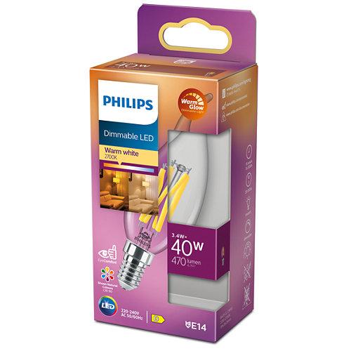 Philips LED kaarslamp transparant E14 3,4W (40W) warm wit dimbaar geeft je lamp een zachte, warm witte gloed die meteen sfeer brengt in je huis. Dankzij het lage verbruik van 3,4W per lamp (vergelijkbaar met een traditioneel verbruik van 40W) geniet je van hetzelfde licht, maar dan energiezuinig en met een lange levensduur. Door de WarmGlow dimfunctie creëer je een warmere gloed naarmate je de lamp dimt. Deze kaarsvormige lamp heeft een E14-fitting en is dimbaar.