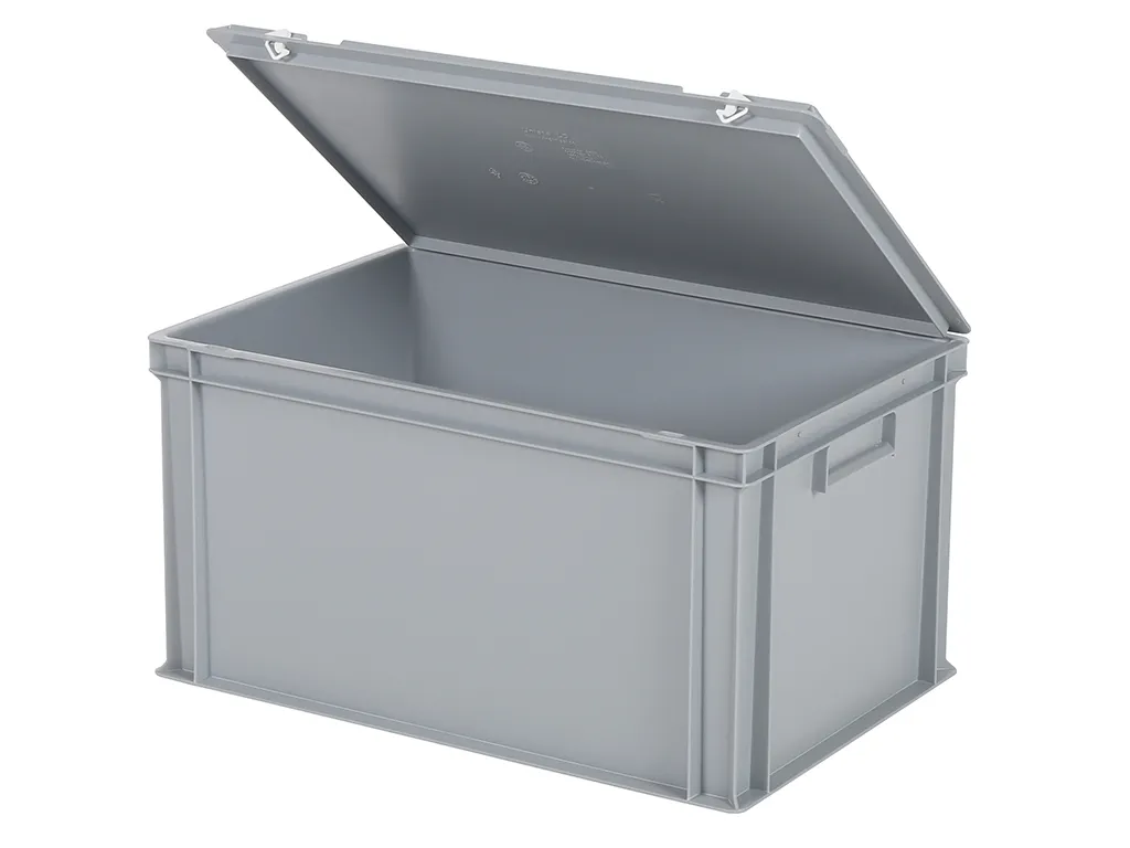 Grijze kunststof stapelbak in Euronorm-formaat met scharnierdeksel en twee snap-schuifsluitingen (600 x 400 x H 320 mm -) uit de SOLID LINE. Geheel gesloten grijze bak met scharnierdeksel in de kleur grijs. Met een gladde bodem en gesloten handgrepen. Optioneel ook leverbaar met open handgrepen. Dekselbakken hebben een afneembaar scharnierend deksel en zijn ook met deksel stapelbaar.