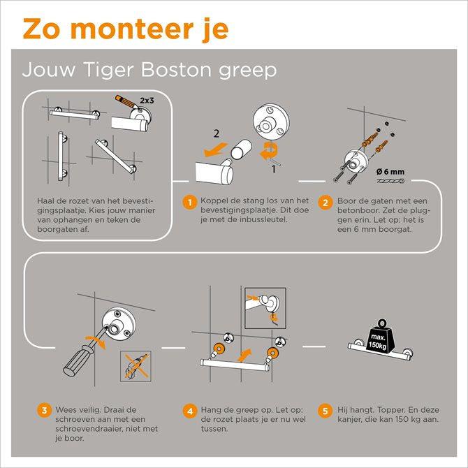 "De wandbeugel 90 cm uit de Tiger Boston Comfort & Safety serie is uitgevoerd in de kleur RVS geborsteld en biedt extra ondersteuning en comfort in de badkamer, de douche en het toilet. De ergonomische veiligheidsgreep heeft een diameter van 25 mm en kan zowel horizontaal, verticaal als diagonaal geplaatst worden zodat ondersteuning wordt geboden waar noodzakelijk. De maximale belastbaarheid bedraagt 150 kg. Daarnaast kan er een extra antislip grip op de veiligheidsgreep gemonteerd worden, deze is apart verkrijgbaar.