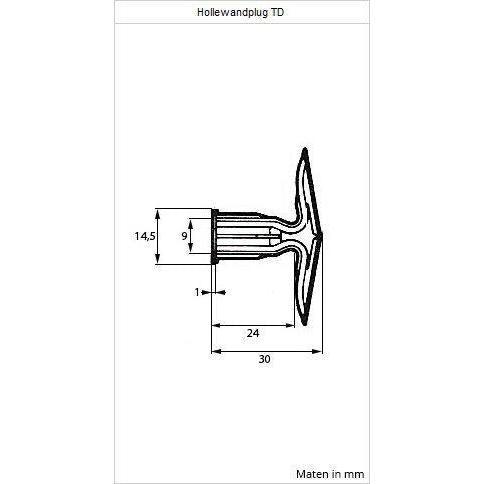 De Toggler Hollewandplug TD gebruik je voor het bevestigen van voorwerpen in holle wanden en plaatmateriaal, zoals dubbele gipsplaat van 2x 12,5 mm dik. Monteer de plug snel en makkelijk met behulp van de bijgeleverde zwarte pin. Het grote draagvlak achter de plaat zorgt voor een sterke houvast. De plug past altijd als de ruimte achter de wand minimaal 17 mm is. Door de grote anti-rotatievleugels draait de plug niet mee wanneer je er een schroef indraait.