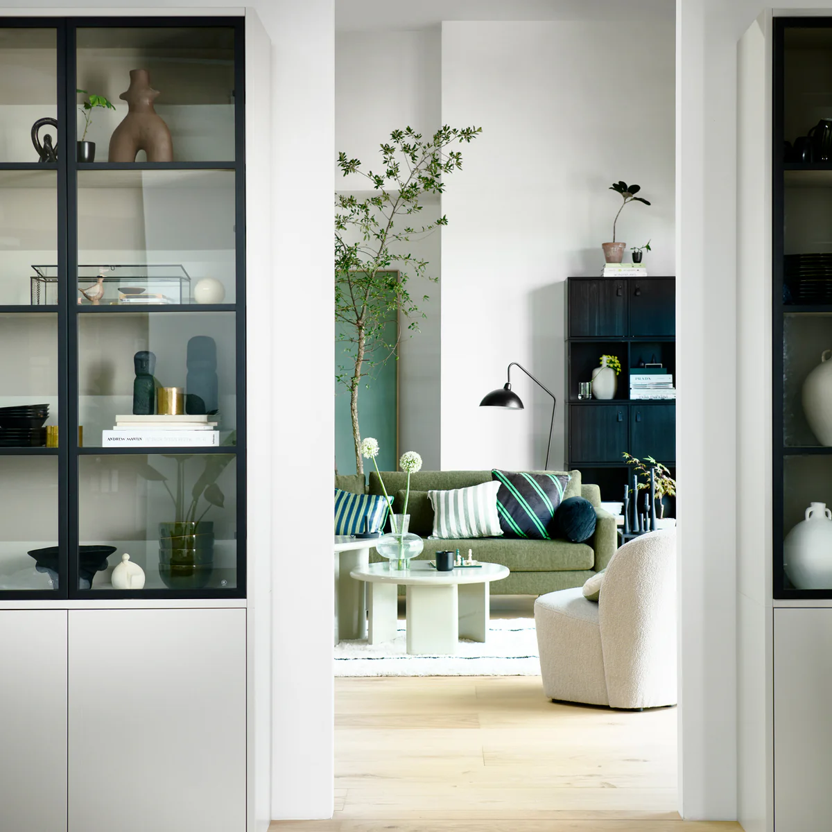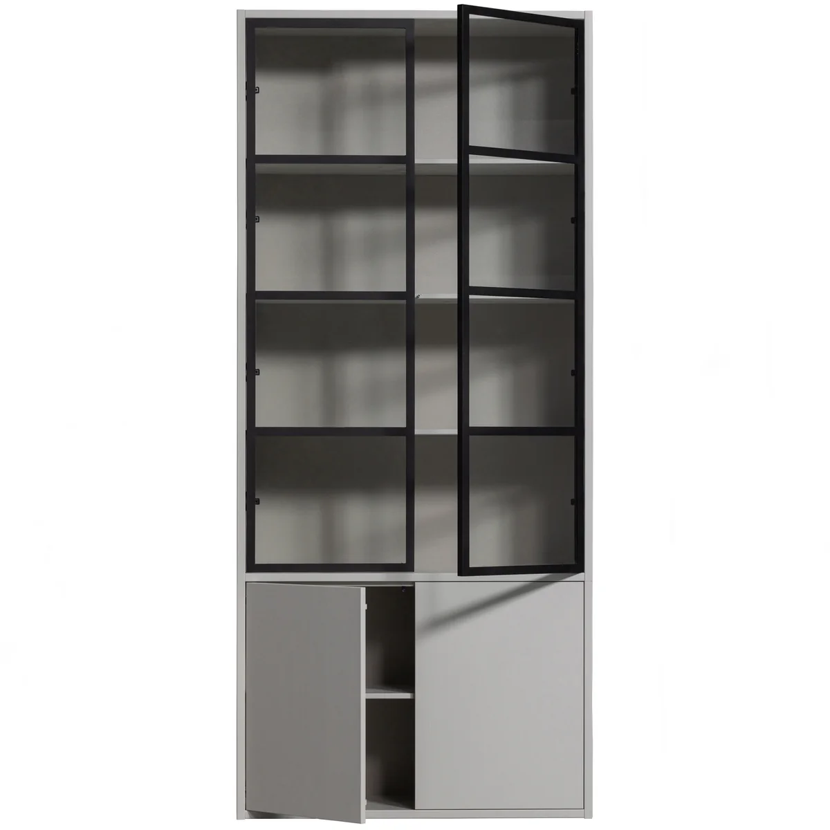 vtwonen vitrinekast Basic 4-deurs van grenen in de kleur mist brengt een rustige, tijdloze sfeer in je woonkamer. Met zijn royale formaat en vier glazen deuren creëer je een mooi podium voor alles wat je graag laat zien: je favoriete servies, fijne decoraties of persoonlijke herinneringen. De zachte misttint geeft de kast een serene uitstraling, waardoor hij moeiteloos opgaat in verschillende interieurstijlen.