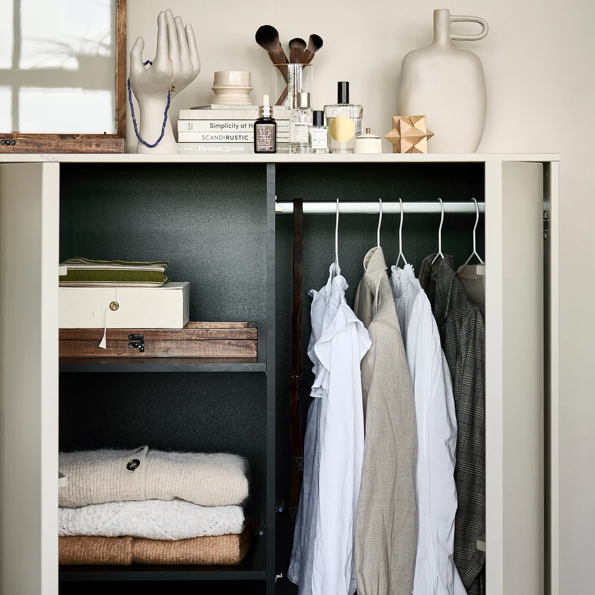 vtwonen kast Daily Closet Double 110x100 cm in de moderne kleur dakargrau biedt een stijlvolle en compacte opbergoplossing die perfect past in kleinere ruimtes. De zachte grijskleur en het strakke ontwerp zorgen voor een rustige basis, waardoor je slaapkamer direct meer harmonie en overzicht krijgt. Je creëert een plek waar functionaliteit en sfeer samenkomen.