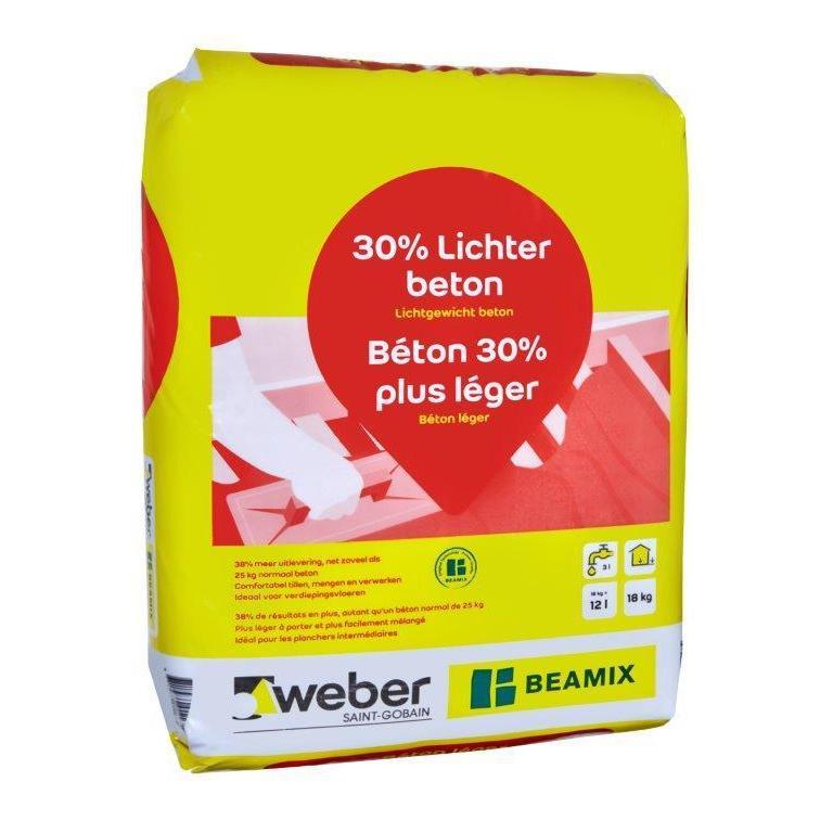 Weber Beamix Lichtgewicht beton is licht en toch sterk. De lichtgewicht beton is net als Weber Beamix Beton super sterk eco geschikt voor bewapende en onbewapende betonconstructies, maar door de samenstelling weegt het 30% minder. Je doet dus meer m2 met minder kg. Dat maakt het product ook geschikt voor lichtere constructies, zoals platte daken, balkons en verdiepingsvloeren.