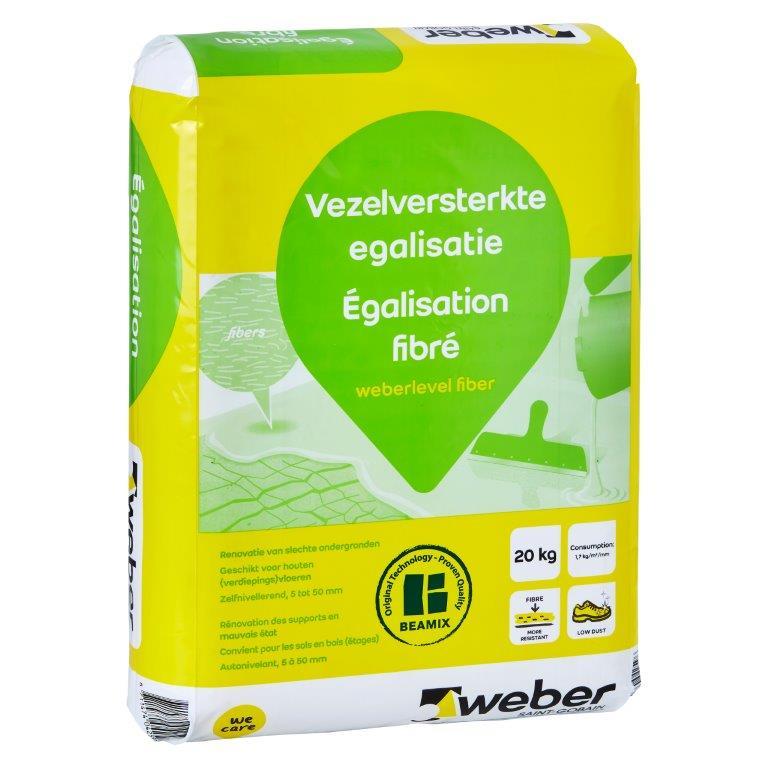Weber Vezelversterkte egalisatie is de basis voor vloerafwerking op slechte ondergronden. De Vezelversterkte egalisatie van Weber is zeer geschikt voor de vloerafwerking van houten (verdiepings)vloeren. Weber Vezelversterkte egalisatie is zelfnivillerend en geschikt voor het egaliseren in laagdiktes van 5-50 mm.