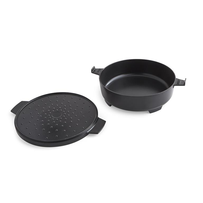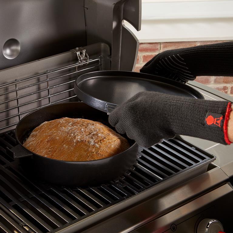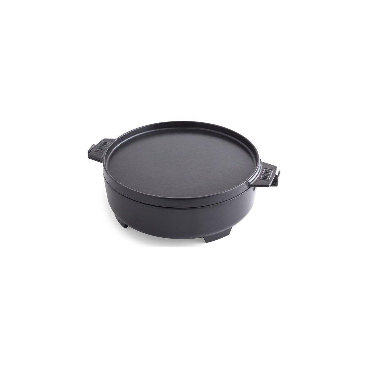 Dit veelzijdige kookgerei biedt eindeloze mogelijkheden voor op de barbecue. De gietijzeren Dutch Oven van 6,8 liter biedt een gelijkmatige warmteverdeling en -behoud voor malse braadstukken en smakelijke soepen en stoofschotels. Het deksel met dubbele functie kan worden gebruikt als platte bakplaat om broodjes te roosteren of kippenborst en groente perfect te garen. Dankzij de porselein-geëmailleerde finish is de Dutch Oven makkelijk schoon te maken en de twee onderdelen kunnen perfect op elkaar gestapeld worden voor plaatsbesparend opbergen.