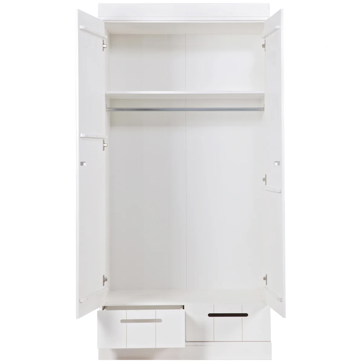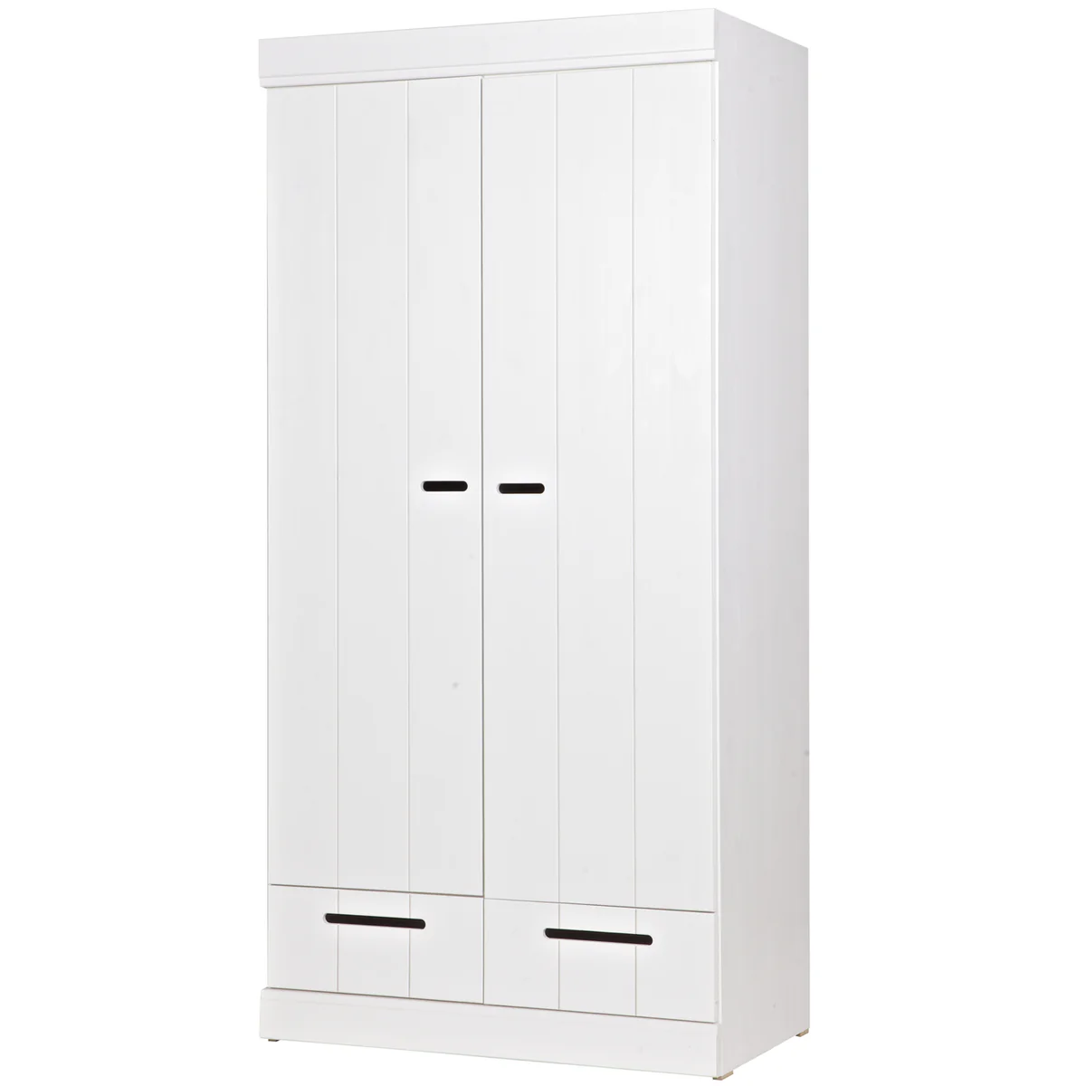 WOOOD kledingkast Connect 2-deurs met lade en strokendeuren in helder wit brengt direct rust en harmonie in je slaapkamer. De verticale belijning geeft de kast een frisse, moderne uitstraling, terwijl het compacte ontwerp perfect is als je graag een opgeruimde, luchtige ruimte creëert.