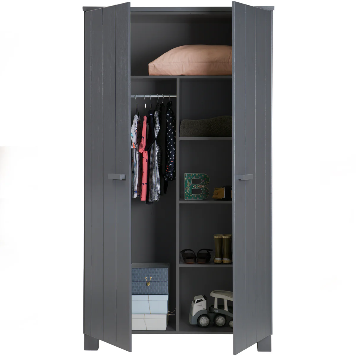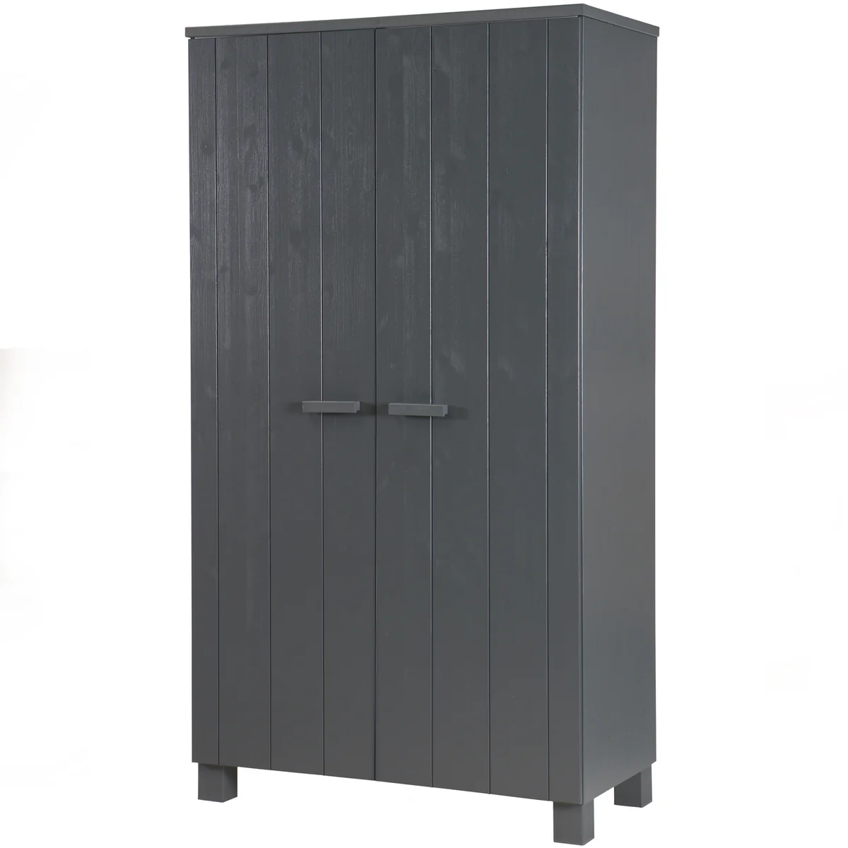 WOOOD kast Dennis in steel grey geborsteld brengt direct een stoere, tijdloze uitstraling in je kamer. Het massieve grenenhout, met zijn subtiele nerven en zacht geborstelde finish, geeft de kast een warme, natuurlijke look die jouw interieur meteen meer sfeer geeft. De koele steel grey tint zorgt daarbij voor een moderne balans – perfect als je houdt van rust en stijl.