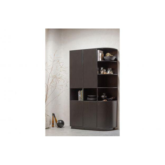 De Finca opbergkast met rond element is een waar pronkstuk in de woonruimte. De open vakken zijn gelijkmatig ingedeeld voor het presenteren van jouw mooiste woondecoratie. De drie deuren houden nog eens een ruime opbergruimte uit het zicht. De vakken hebben een hoogte van 32 cm en een diepte van 37 cm. De onderrand van de opbergkast laat 7 cm ruimte over aan de voorzijde, hierdoor lijkt het meubel te zweven.